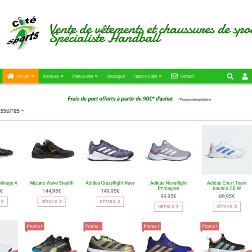 Côté sports vente en ligne de vêtements et chaussures de sport pour homme, femme et enfant, magasin de sport spécialisé handball. Situé à Tarascon proche de Beaucaire. Propose des équipements pour divers sports (running…), sports d'équipe (handball, football…).